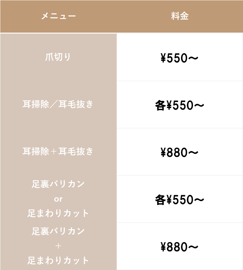 ・シャンプーコース:シャンプーブロー+爪切り・耳掃除・足裏バリカン・足まわりカット・肛門絞り