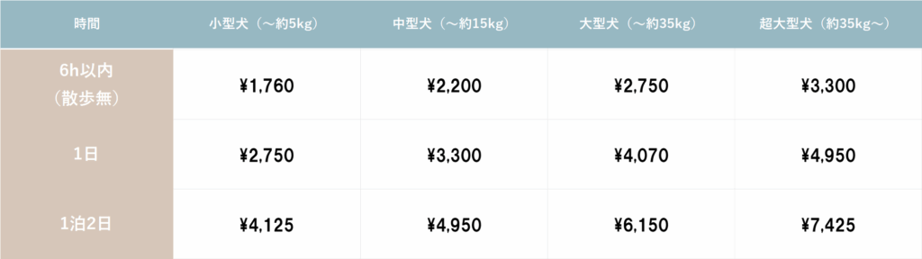 ※2泊以上は1日料金×日数となります(例:小型犬3泊4日の場合:¥2750×4日=¥11000)